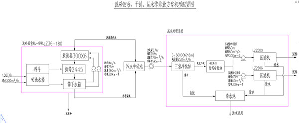 物料進入洗砂回收一體機(LZ36-180)葉輪水箱,經洗砂回收一體機處理后的物料顆粒由出料口排出,經由皮帶機運送到料堆,旋流器溢流尾水自流進入污水中轉水池(4X4m),污水中轉水池中的廢水由立式泵(8/6)抽取進入三氫凈化體(S-6000)。