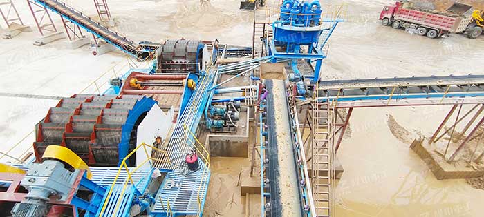 在運轉中,電機經過皮帶輪帶動葉輪進行慢慢的滾動,物料在葉輪的滾動下進行翻滾和沖突,進而清洗物料外表掩蓋的雜質,并損壞包覆在砂粒上的水汽層,便利于脫水,然后一起在加水,構成強壯的水流,將雜質及粉塵帶走,最后完成清洗工作。